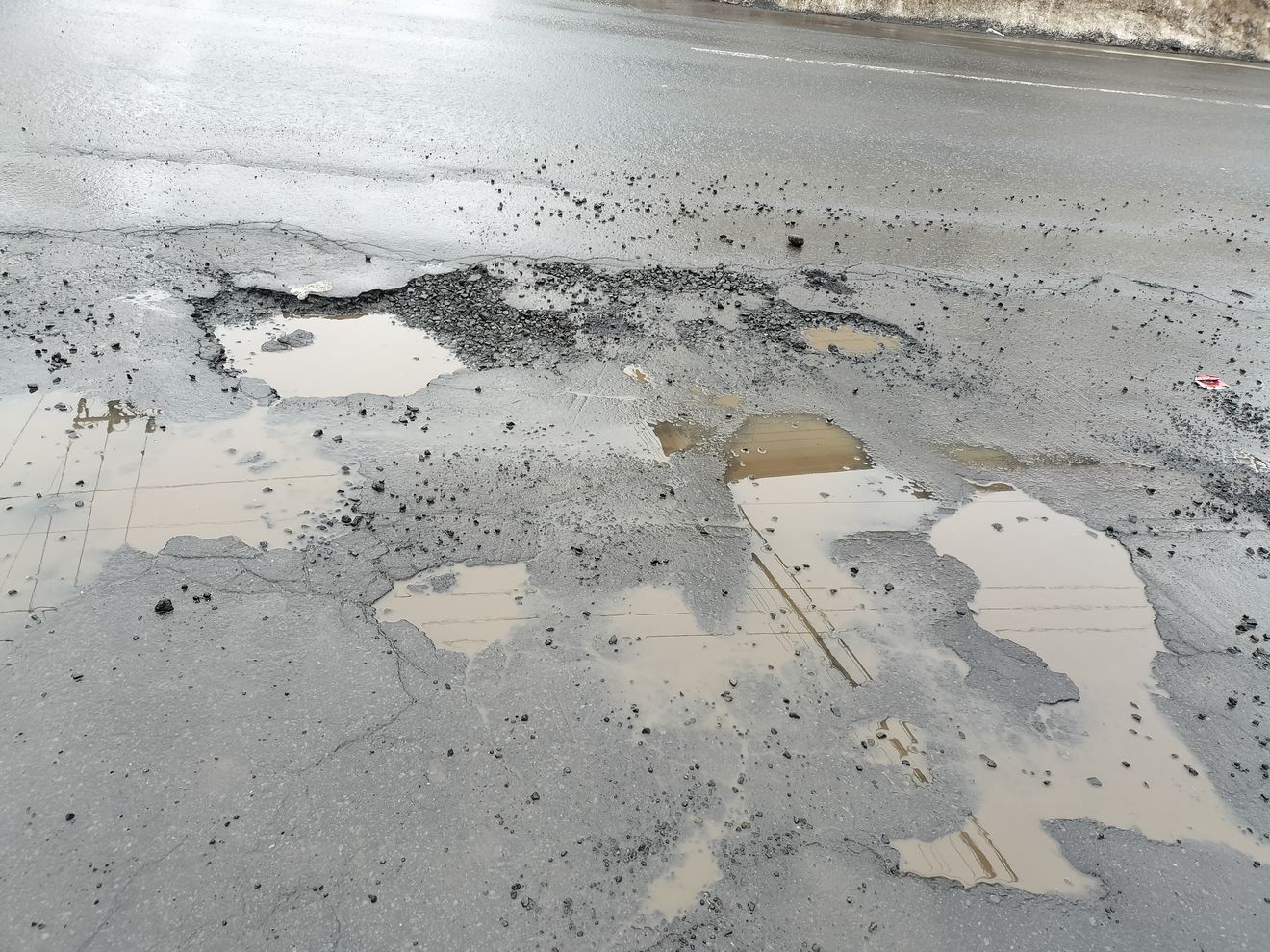 一見すると乾いたアスファルト路面に見えても、よく見ると舗装がえぐれている箇所があります。通行する車が通るたびに削られ、穴は広がり、深くなっていきます。